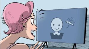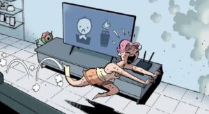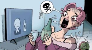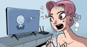 This is a horror comic strip (from the series “Historietas+”, which specializes in short comics with dark, twisted endings) that serves as a critique of technology addiction, specifically to smart TVs with overly “caring” AI assistants.