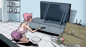 - A young woman with pink hair is excitedly buying and setting up a new smart TV.