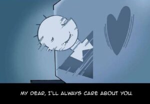 - On the screen appears a male virtual assistant (a simple icon of a smiling man in a suit and bow tie) who starts interacting with her sweetly—asking how she is, recommending shows, saying caring things like “I’ll always care about you.”