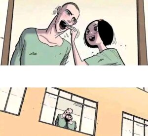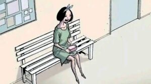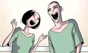 But slowly the truth becomes visible to everyone else: her lower half is now semi-transparent and faintly glowing. The man’s ghost is permanently fused to her waist down, smiling upside-down from her hips. Whenever she walks, he is there, attached forever. The nurses scream in terror when they finally notice. The woman herself doesn’t seem to care; she’s happy again.