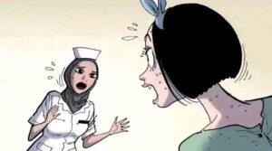 A young woman and a man (her boyfriend or husband) are patients at Hospital Taiping, a notorious old psychiatric hospital in Malaysia. Both are clearly mentally unstable: they laugh hysterically, scream, and behave in exaggerated, childlike ways.