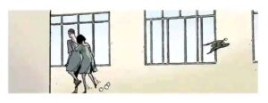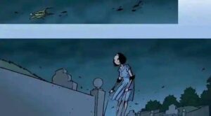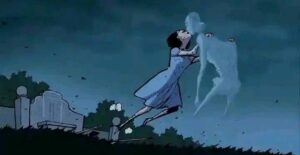 One day the man jumps (or is pushed) out of a high window and dies. The woman is devastated. She limps to his grave on crutches, weeping uncontrollably. While she’s crying at the tombstone, a small green ghost (the man’s spirit) appears above her, smiling mischievously.
