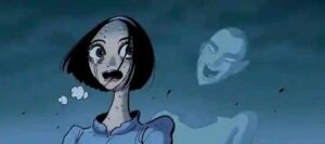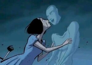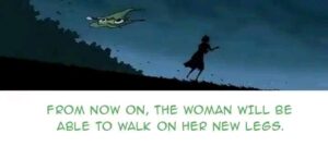 That night the ghost returns to the woman and literally rips his own legs off his spectral body, offering them to her. Desperate to “walk together again” and unable to live without him, she accepts. The ghost attaches his ghostly legs to her stumps. From that moment on, she can walk perfectly again… because his dead legs are now hers.