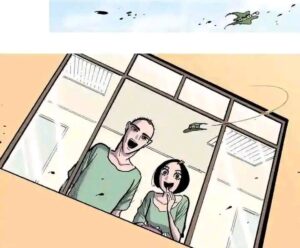 The final panels show the couple cheerfully gazing out the hospital window together, arms around each other, while outside the building looks exactly the same as it did at the beginning, implying the cycle will continue with the next pair of broken people.