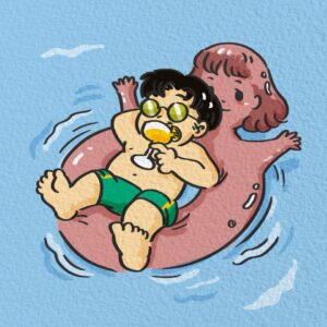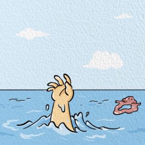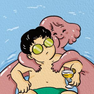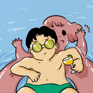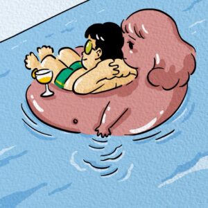 The guy is now half-sunk, the deflated doll limp around him, his cocktail still in hand, but he’s clearly going under.