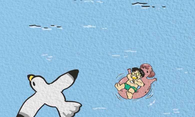 (Sometimes an extra panel is added) The doll, now fully deflated and looking pathetic, drifts off alone while the guy has vanished beneath the surface.