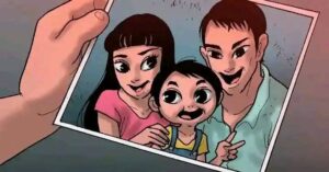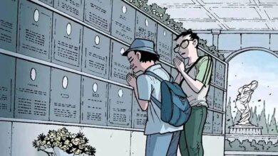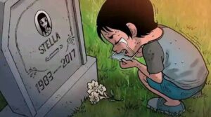 The last panels show the boy kneeling at a grave marked “Stella 1983-2017” (his real mother), finally understanding that everything the ghost did was to protect him and punish the people who took her place. The “happy” family photos on the wall now feel hollow and mocking. The cycle of quiet, domestic revenge is complete, and the boy is left alone with the truth.