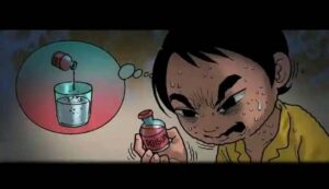 But the boy quickly realizes something is deeply wrong. His stepmother and father constantly pressure him to drink certain liquids (shown as bottles labeled “poison” or “aphrodisiac” in his frightened imagination). Whenever he refuses or hesitates, they become menacing. He starts sneaking around the house at night, spying on them, hiding bottles, and trying to protect himself. He discovers old photos and realizes his real mother (a gentle-looking woman with long black hair) disappeared under mysterious circumstances years earlier.